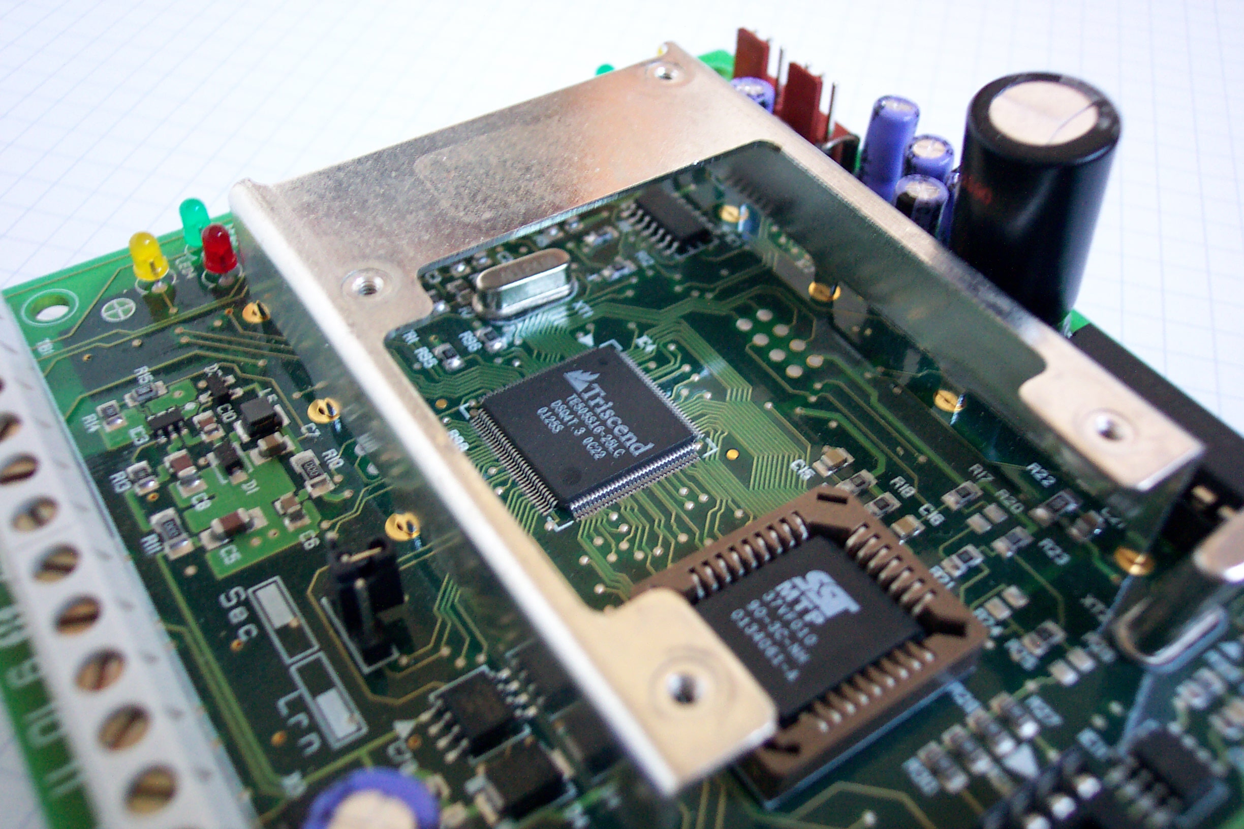 The previous generation of STU was based on an 8051, and the Triscend E505 was selected as the basis for the new "GSM STU". The Tricend E505 integrates an 8051 processor, 16K of SRAM and 512 cells of configurable logic onto a single chip with up to 124 IO lines - thus maintaining code & processor architecture compatibility with the existing STU whilst adding the enhanced capabilities necessary to support the demands of the added GSM features. The configurable logic allowed the implementation of a PWM generator and two UARTs, whilst having no external "glue" logic at all. |